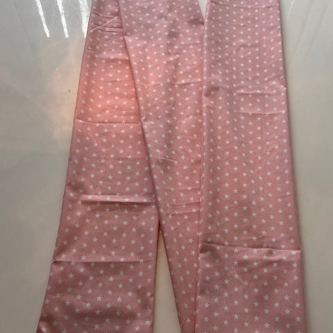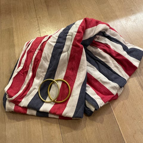 💜🤍 selger en Soul ringslynge i lilla og hvitt mønster. Lengde ca. 2 meter. 100% bomull (oppgitt av tidligere eier). Ingen merknader eller synlig slitasje.