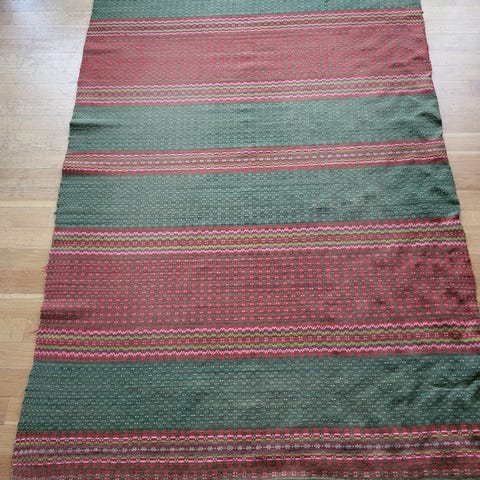 Dette er tradisjonell svensk flatvev, brukt som veggteppe, åkle eller løper. Håndvevd, ikke maskinprodusert. Pent brukt med normal alderstypisk slitasje. Mål: L: 150 cm/B: 76 cm.
