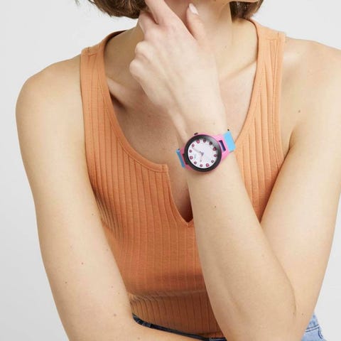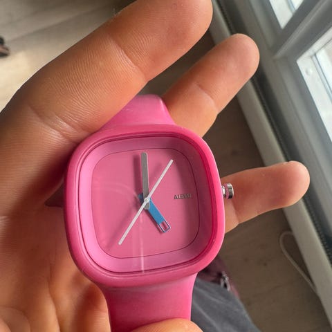 Klokken har en rosa gummirem. Den har et digitalt display, med urskiven beskyttet av mineralglass. Urverket drives av et kvartsbatteri.