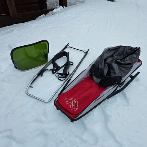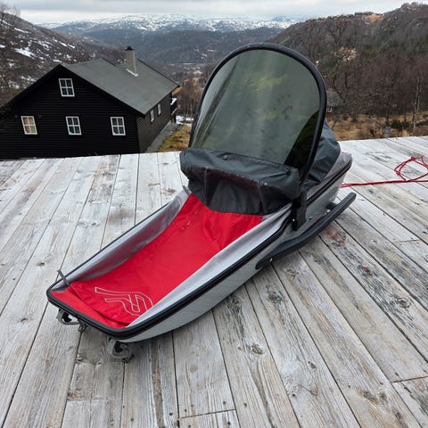 Brukt fjellpulk med pose, klar for nye oppdrag