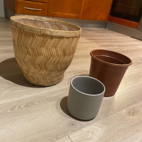 Sett med flere blomsterpotter i plast i ulike størrelser og farger, inkludert svarte og terrakottafargede potter. Inneholder også gjødsel, plantepinner, kokosfiberstrimmel for støtte, og små "klyper" til å feste planter. Egnet for innendørs- og utendørs bruk til planting og hagearbeid.
