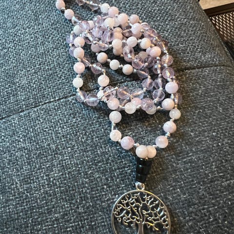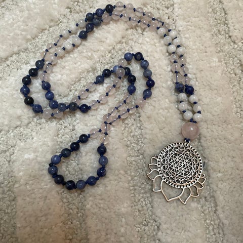 Mala smykke av rosa aventurine, clear quartz med cracked crystal guru og blå dusk. 6mm perler.