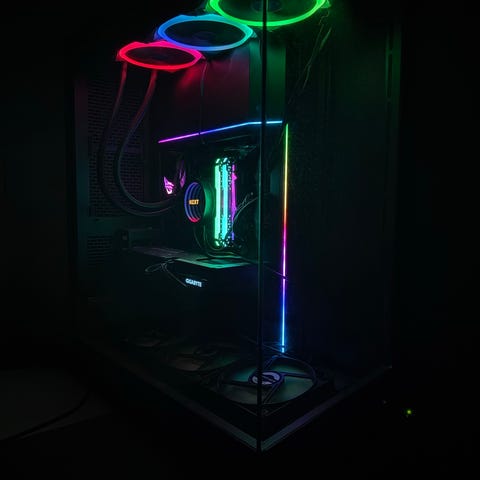 Asus stasjonær PC med RGB-belysning, utstyrt med flere kjølevifter med fargerikt LED-lys. PC-en har et gjennomskinnelig sidepanel som viser interne komponenter og lysdetaljer. Passer for bruk som gaming-PC eller generell databehandling.