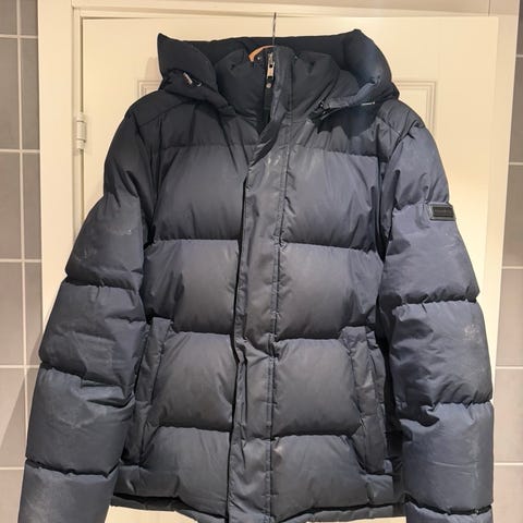 Nydelig marineblå dunjakke fra Cedrico. Laget av polyester med dunfyll. Avtakbar hette, to lommer foran, knapper foran. God og varm.