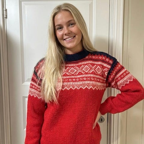Selger en eksklusiv, håndstrikket genser i 100 % ren ull. Genseren er tung, varm og av svært høy kvalitet, laget for å vare. Klassisk nordisk mønster med originale vintage olympiske knapper.
