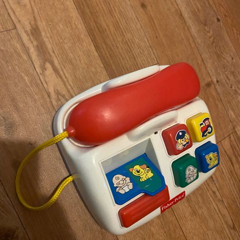 Fisher-Price leketelefon for barn med fargerike knapper og snor. Laget i plast, designet for små barn til lek og læring.