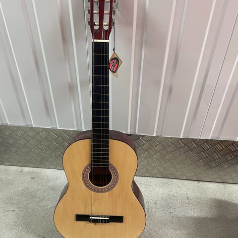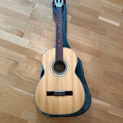 Selger en pent brukt klassisk gitar i 39" størrelse. Gitaren har helmassiv gran-topp (solid spruce) som gir en varm, klar og resonant tone med god projeksjon. Den er godt intonert, har riktig strenghøyde og er helt klar til å spille på – perfekt både for nybegynnere og viderekomne.