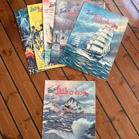 Skipet er et tidsskrift med fokus på skipsfart og maritim historie. Samlingen består av flere utgaver med ulike utgaver og temaer relatert til dampbåter, veteranbåter og skipsfartshistorie. Tidsskriftene er i svart-hvitt med enkelte fargeomslag.. pris pr stk