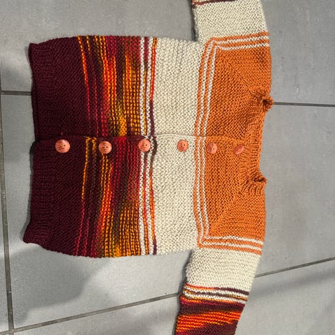 Hjemme strikket. Brukt på to barn. Brukt fra 3 til 5 år (da sønnen er stor så kan det være at det passer en mindre 6 åring også). Klør ikke.