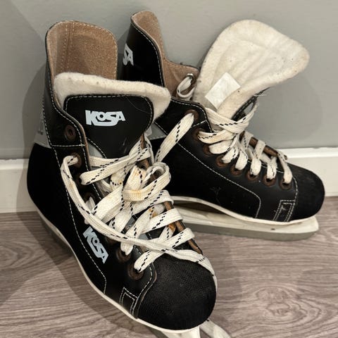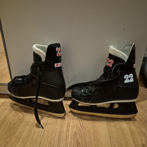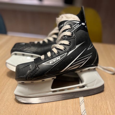 CCM Ishockeyskøyter i størrelse 34 for barn. Skøytene er svarte med hvite lisser og har en innvendig fôring for komfort.