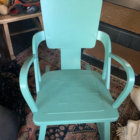 Pen utgave av Per Aaslid gyngestol med rosemalt rygg. Dette er en designklassiker som er godt bevart. Stolen er nå på Borøya (4916), men kan fraktes til Bergen i slutten av måneden.