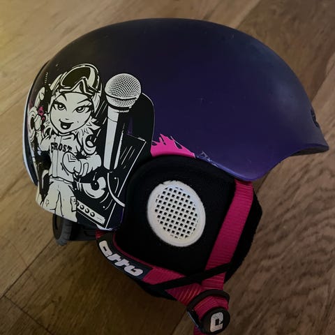 Pent brukt hjelm dere både spennen bak til brillene og stroppen under haken er i god stand. Mørke grå fatle på hjelmen, fint paddet innvending. Har brukt denne mest til skøyter.