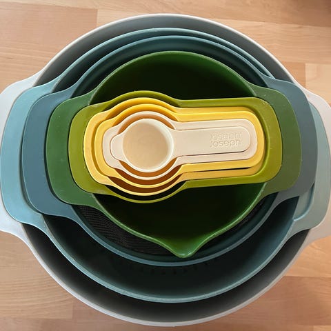 Dette skålsettet fra Joseph Joseph består av 9 deler som er essensielle på kjøkkenet. Du kan samle alle delene så de ikke tar så mye plass og de er derfor praktiske til oppbevaring i skapet. Den store skålen har en sklisikker base og brede håndtak. Den lille skålen har integrert litersmål og en tut så du enkelt kan helde fra den. Du får også et dørslag og målekopper så du er utrustet for alt innen matlaging og baking. Det er et praktisk og funksjonelt sett som kan brukes i alle hjem og som også er en perfekt gaveidé til studenten som snart skal ut i verden.