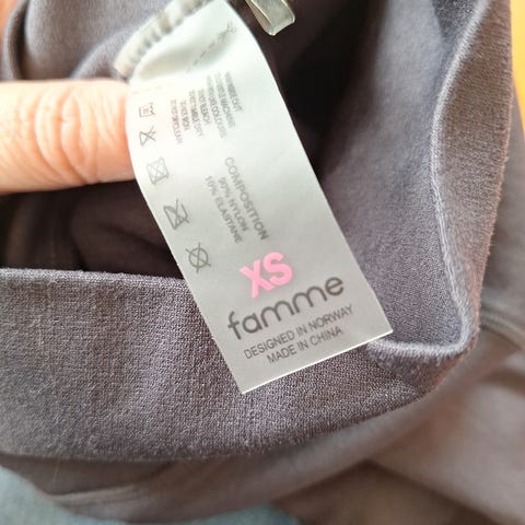 Pent brukte tights med scrunch fra Famme. De to flerfargete er i størrelse S, men oppleves mer som XS.