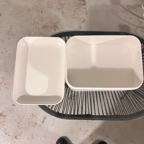 IKEA oppbevaringsbokser i sett med flere størrelser. Boksene er laget av grått stoff med et rutete mønster på innsiden. Passer til oppbevaring av ulike småting i hjemmet.