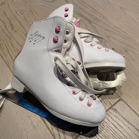 Skøyter barn størrelse 30. Skøytene er hvite med rosa detaljer og har snøring.