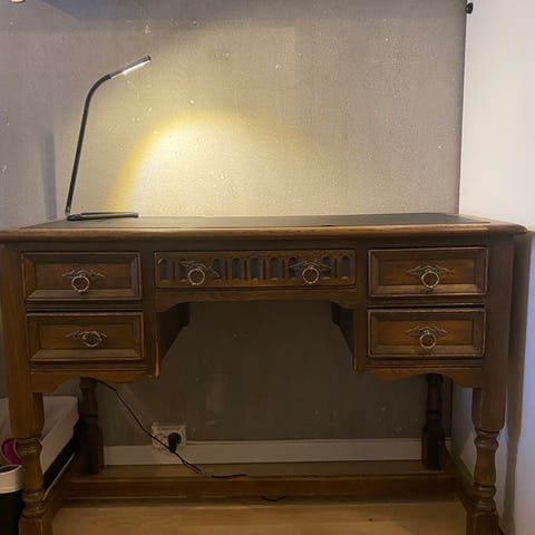 Søtt lite skrivebord med mange fine finurligheter. Det trenger litt kjærlighet for å bli godt som nytt, men fungerer fint slik det er også.