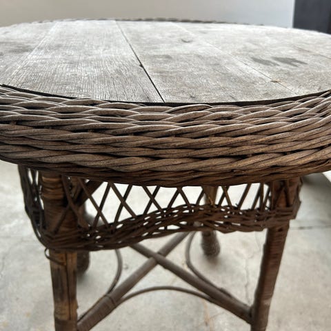 Rundt bord laget i rotting, egnet for utebruk. Passer godt på balkonger eller terrasser som et lite spise- eller kaffebord.