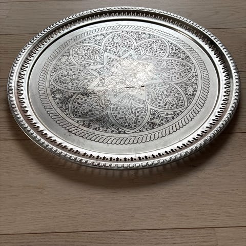 Bohus serveringsfat i metall med tre nivåer. Fatet har en rund form og er utstyrt med et håndtak på toppen for enkel transport. Egnet for servering av småretter eller snacks.