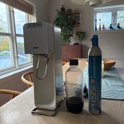 Sodastream Hvit brusmaskin med tilhørende plastflaske for karbonering av vannn, Selges pga flytting