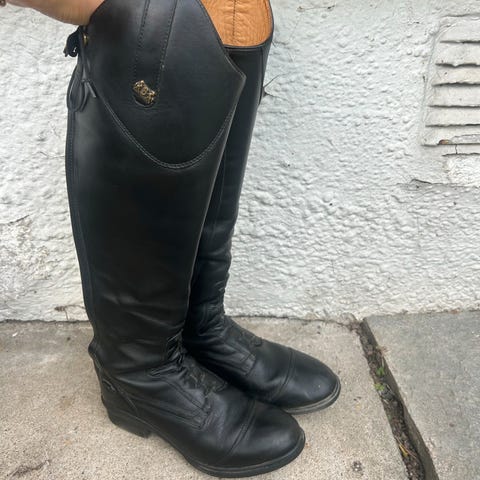 B vertigo ridestøvler str 40 selges. Normal 40 str. Se ellers mål på bilde, mener de er regular /normal i leggen. Passer meg fint som verken har for store eller for tynne legger. Kjøpt nye fra Horze for 2-3 år siden. Betalte over 3000kr. I god stand. Selges da jeg har for mange ridestøvler rett og slett.