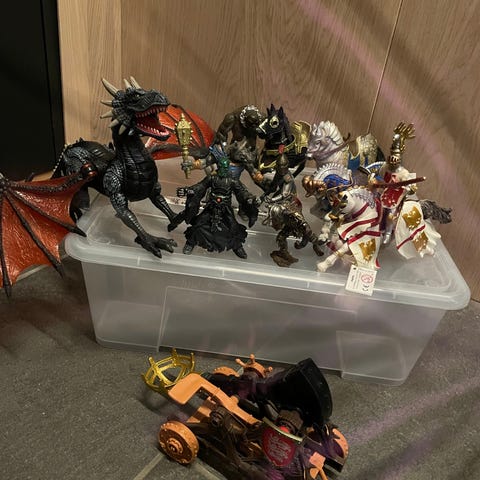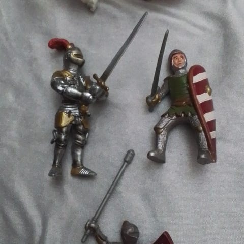 Sett med figurer som inkluderer middelalderske riddere på hester og drager. Riddere er utstyrt med rustninger og våpen, og drager har detaljerte vinger og kropper. Passer til samling eller lek med middelaldertema.