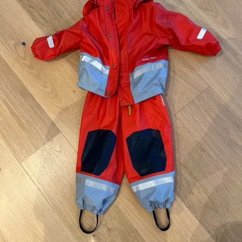 Godt, men pent brukt Galon regntøy fra Didriksons i størrelse 90. Foret med fleece-for. Noen bruksmerker og løs søm to steder rundt magen i buksa i overgangen mellom regnstoffet og fleece-foret, men har lite å si for bruken. Strikkene under føttene er intakte.