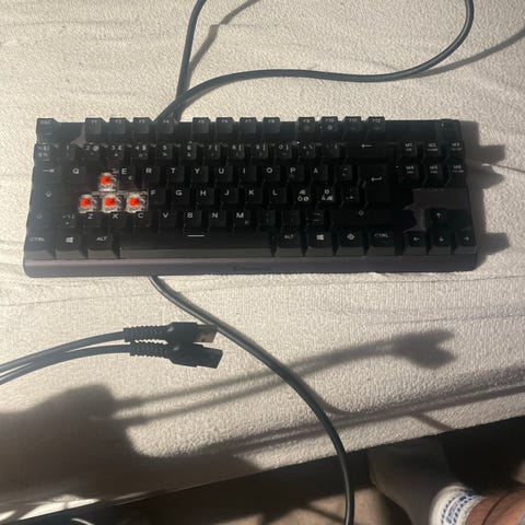 Steelseries Apex 7 er et tastatur med mekaniske taster (brune), USB-kabeltilkobling til mus og RGB-belysning som kan styres fra app på PC-en. Tastaturet har et robust design med medieknapper og programmerbare makrotaster. Passer best til gaming, da det lager litt lyd. Selges grunnet salg av gaming-PC og da det ikke blir brukt. Kjøpt nytt for 2199 på komplett.