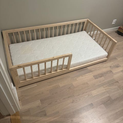 Jollyroom juniorseng med dekorative bilder av kjøretøy på hode- og fotende. Sengen er laget i tre og har lameller for madrassstøtte. Den er egnet for barn og har en enkel, funksjonell design. Noen mindre skader er synlige på ben og ramme. Brukt til to barn med disse. Følger også med innlegg for å hindre knirk