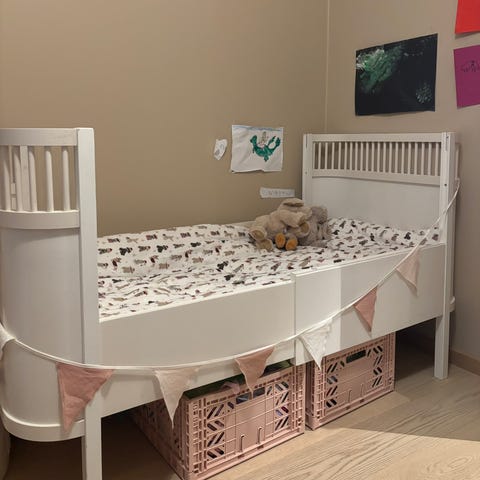 Uttrekkbar barneseng fra 40-tallet. Sengen er godt brukt, men fungerer ypperlig. Den har en uttrekkbar funksjon som gjør det mulig å justere størrelsen etter behov. Trenger litt kjærlighet for å bli som ny, men kan brukes som den er. Mye sjarm.