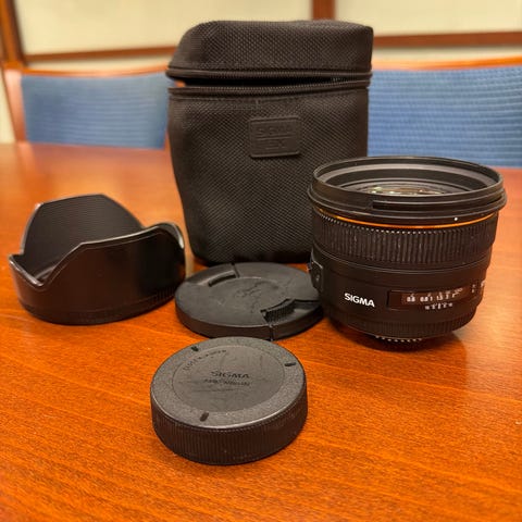 Sigma EX DG HSM 50mm f/1.4 objektiv for Nikon-kameraer. Objektivet har en brennvidde på 50mm og en stor blenderåpning på f/1.4, noe som gir gode muligheter for fotografering i svakt lys og kontroll over dybdeskarphet.