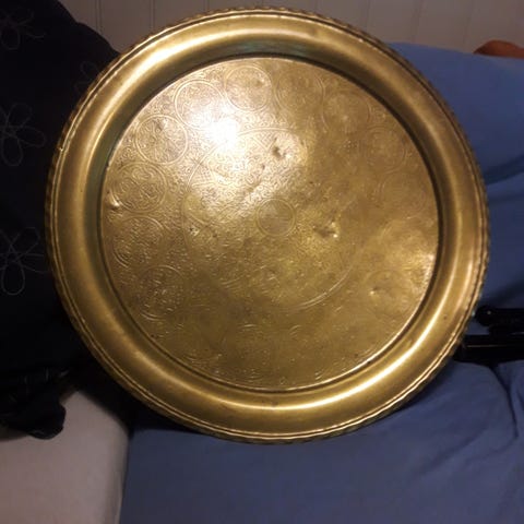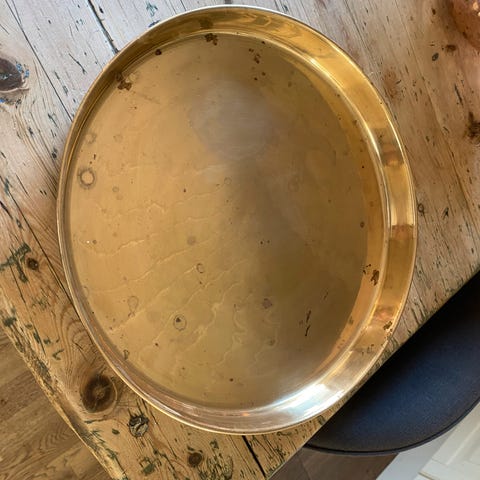Den er I god stand. Trenger bare pussing. I midten er putti. Tung. Høyden 12cm og diameter 24cm.