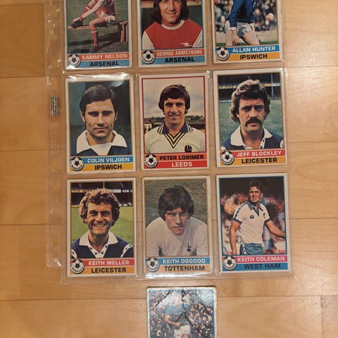 Fotballkort. De fleste kun tatt ut av pakken, men små bruksmerker på noen få. Selges for kr 4 pr kort eller høystbydende over. Hentes Konnerud eller sendes. Kan sende med Posten for billigere porto.