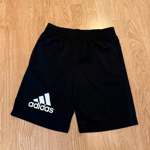 Adidas barneshorts for gutt i størrelse 152. Shortsen er svart med hvite striper på sidene. Laget av materiale egnet for barn.
