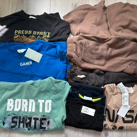 Pent brukte hettegensere og hettejakker. Grei stand. Et par har nupper. Er par er lite brukt. 1 er brukt en gang. Svart Champion har noe hull sydd ved ermkanter.