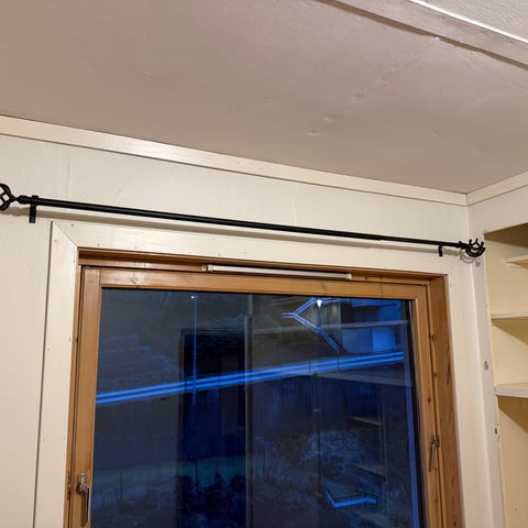Selve gardinen er 1 meter bred, med oppheng er den ca 106 cm bred. Gardinen er brukt og har blitt farget i kantene der den har skrapt mot åpent vindu, men ellers fullt funksjonell.