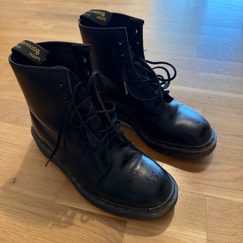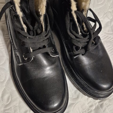 Sorte vinterskoletter i skinn, størrelse 39. Fôret med saueskinn. Brukt kun et par ganger. Merke Lille Vinkel sko.
