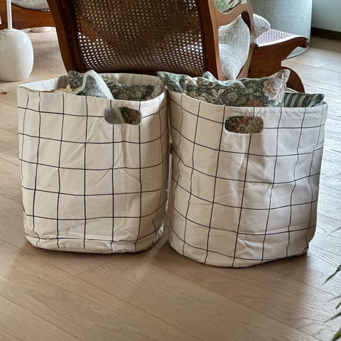 Selger en nydelig hvit kurv med blå streker fra Mifuko.