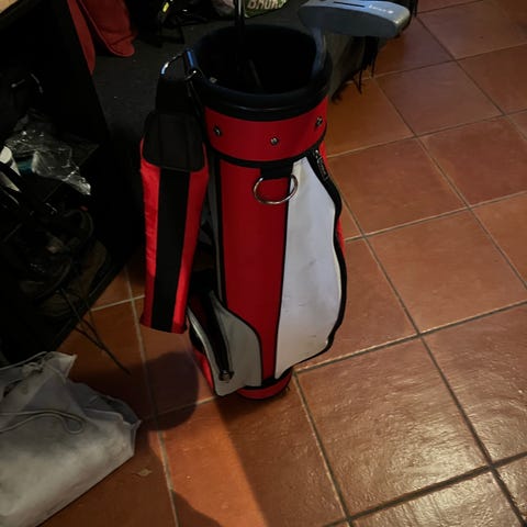 Wilson Player Fit golfbag. Golfbagen er blå og svart, laget med materialer som gir holdbarhet og funksjonalitet under spill. Designet for å bære golfkøller og tilbehør på en komfortabel måte.