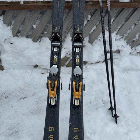Atomic ski med bindingssystem og Head skistøvler i svart og hvitt med flere spenner for justering. Ski og støvler er egnet for alpinski og vinterbruk.