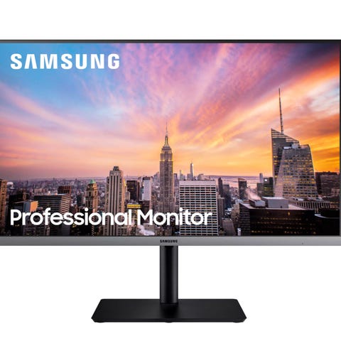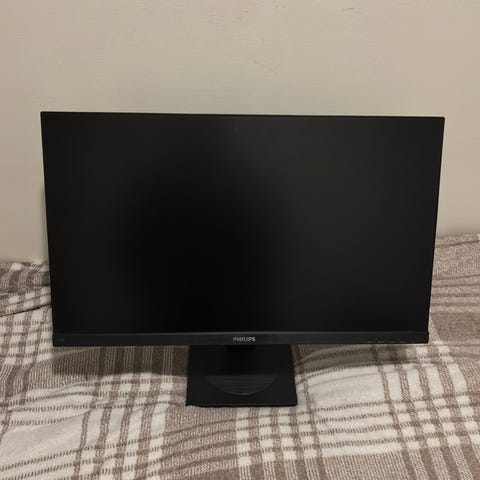 Philips 273V5L 27" skjerm med svart ramme og rund fot. Skjermen har en størrelse på 27 tommer og leveres med strømkabel.