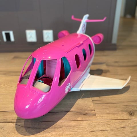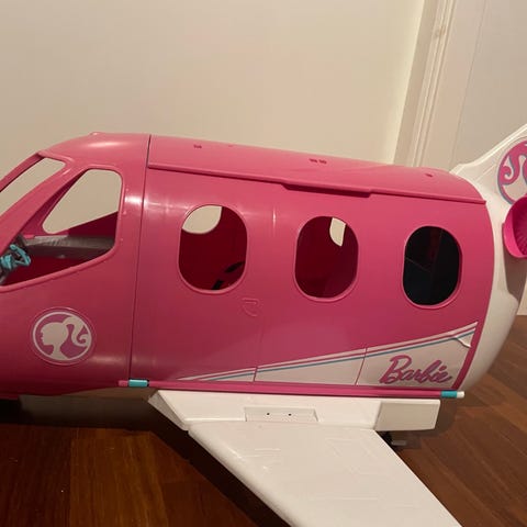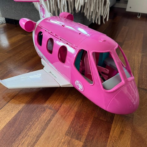 Barbie lekefly i rosa og hvit med plass til flere passasjerer. Flyet har åpne sider med seter og interiørdetaljer. Egnet for barn som leker med Barbie-dukker.