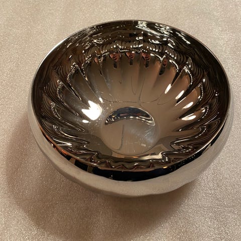 Georg Jensen bolle i rustfritt stål. Bollen har en rund form med en dekorativ, bølget kant i modellen «Legacy» som er en utgått modell.