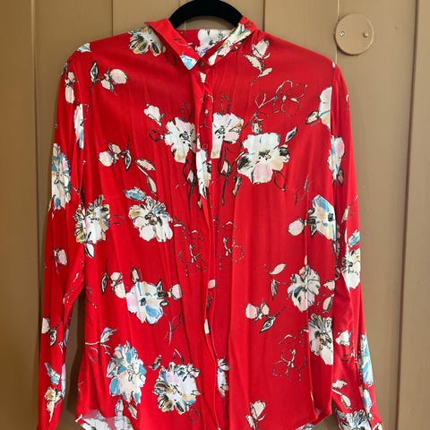I 100% rayon. Den er grå, med blomstermønster i en beige/naturfarge. Str S, men noe romslig i str. derfor lagt inn som str M. Noe lengre bak, enn foran. Strikk nede ved ermene. Feminin og behagelig på. Kun brukt et par gnager. Koster 1200kr ny.