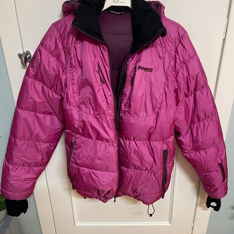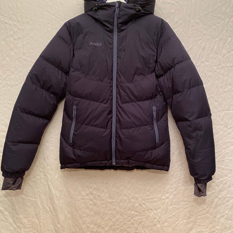 Lite brukt Bergans varm vinterdunjakke dame i størrelse L, farge mørkeblå. Jakken har hette og glidelåslukking foran,