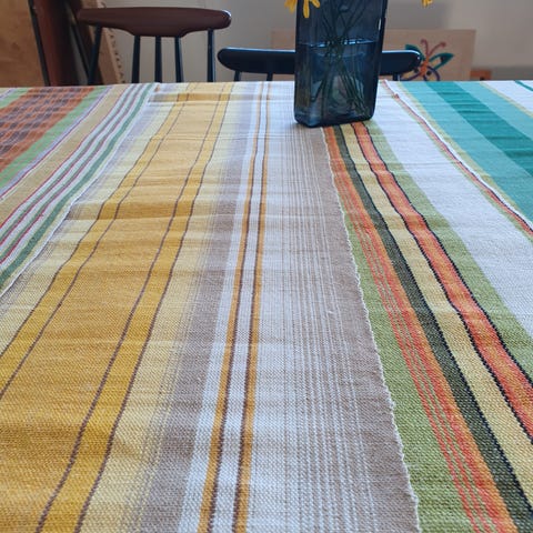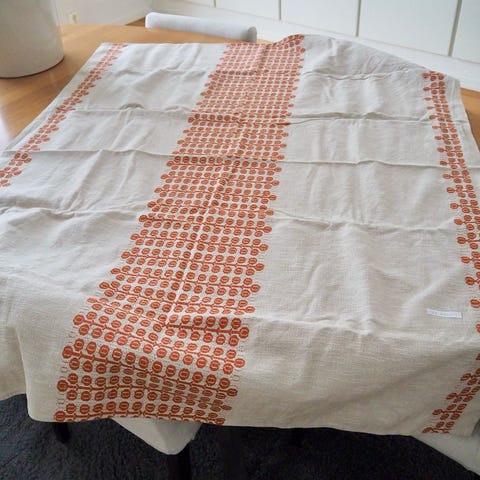 Retro / vintage duk fra Barker textiles Finland. Turkis bunnfarge, blå og hvite striper.