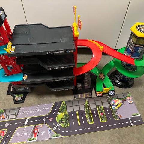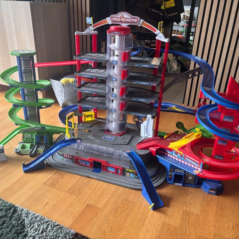 Dicki toys parking garage. Var julegave. Montert og satt på klister, ville ikke ha den likevel. Nå står den her og støver ned. Vil helst ta den fra hverandre, men kan la den stå om noen vil ha den ferdig montert. Da den ikke er brukt og nypris er 600kr, håper jeg på 450kr for den. Hentes Sola