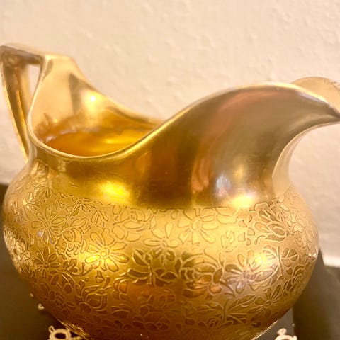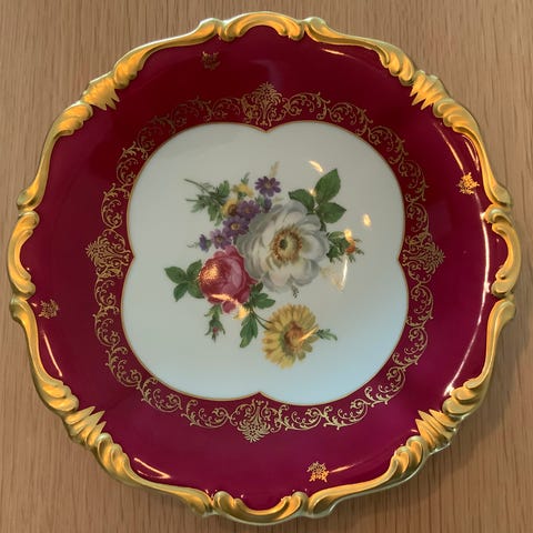 Dette er en dekorativ serverings-/pynteskål i porselen med bronsefarget metallstativ, produsert av De Bronces E. Torrijos S.L. (Spania).