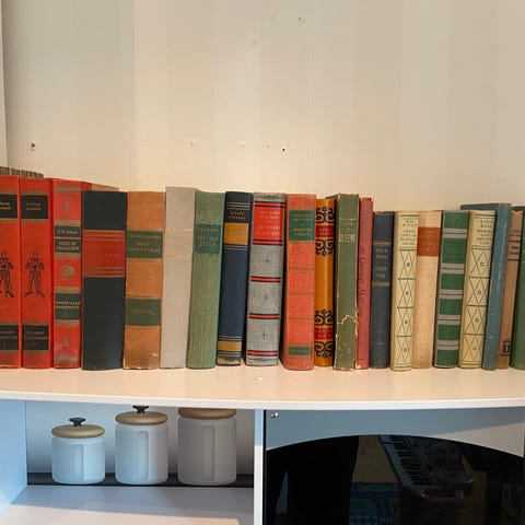 Tilstanden varierer fra god til slitt, men de fleste er solide og godt bevart med tydelig preg av alder og historie. Perfekt for samler, litteraturinteressert, dekorativ bokhylle eller hytteinventar.