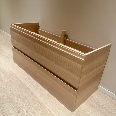 2 av skuffene har innvendige skillevegger for organisering. Det er båret hull i midten av begge de øverste skuffene pga rørene under. Fungerer veldig fint uansett pga skilleveggene.